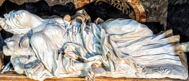 Below the altar table, Saint Anastasia of Sirmium (c. 1685–1690), in marble, a work conceived and begun by Francesco Aprile, but completed by Ercole Ferrata upon the artist's death.[8] The statue, which depicts the saint lying on the pyre of martyrdom, is inspired by Bernini's famous sculpture depicting the Ecstasy of Blessed Ludovica Albertoni (1671–1674).