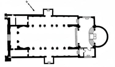 The church, oriented (i.e., with the apse facing east), has a basilical plan ending in a semicircular apse. The interior, divided into three naves by Roman columns with Ionic capitals resting on six pilasters on each side, was richly decorated in 1721-1722 by Carlo Gimach. The side naves are opened in the middle by a rectangular chapel. Note that the transept protrudes slightly beyond the right side, but ends slightly within the line of the left wall.